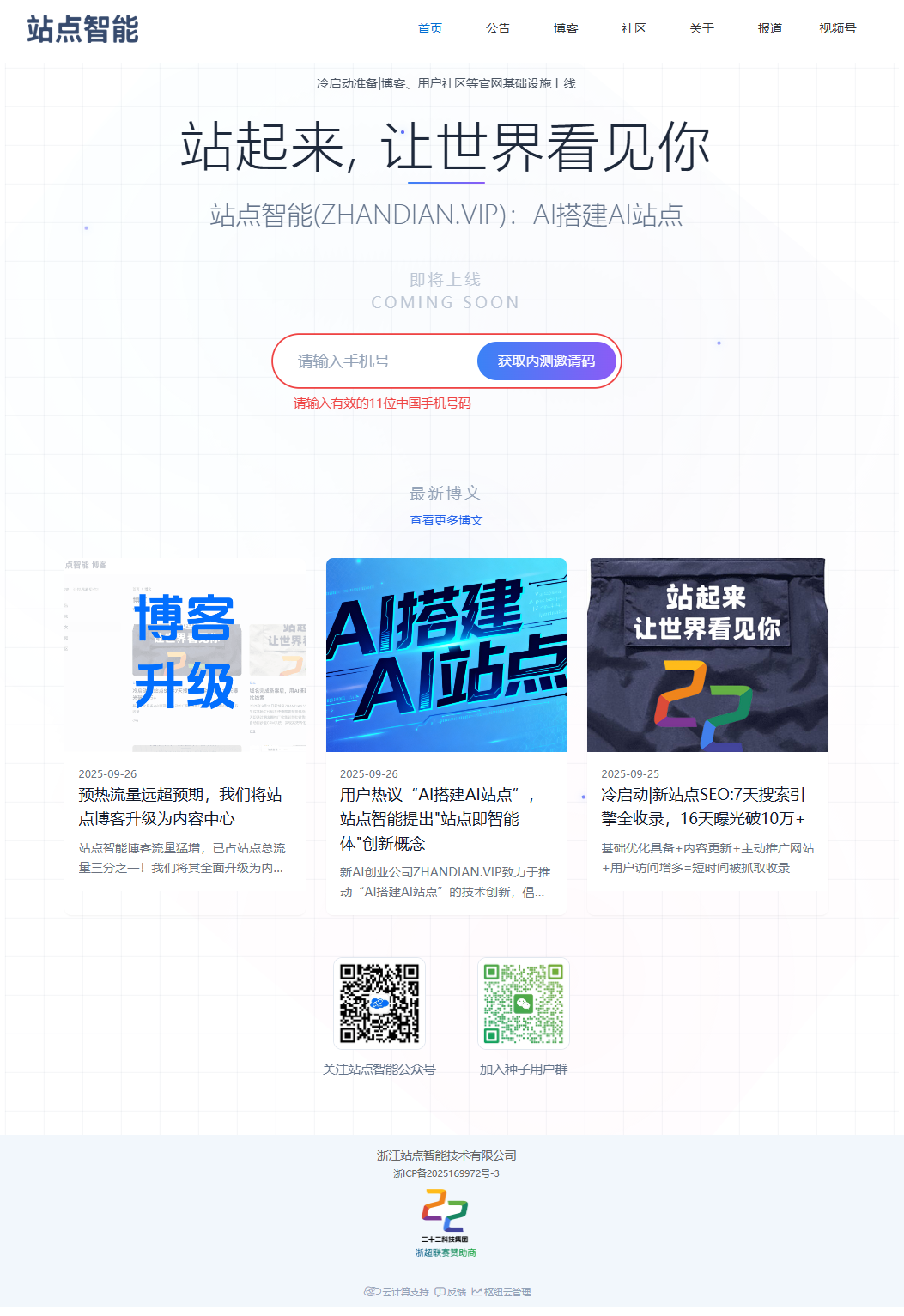 自从站点智能(ZHANDIAN.VIP)官宣 将于10月10日上线α版本后,在各大技术论坛、社交媒体群组及企业交流社群中,讨论热度居高不下。用户热议:站点智能是突破传统建站模式,实现“用AI搭建AI站点”,创造“站点即智能体”新概念。
