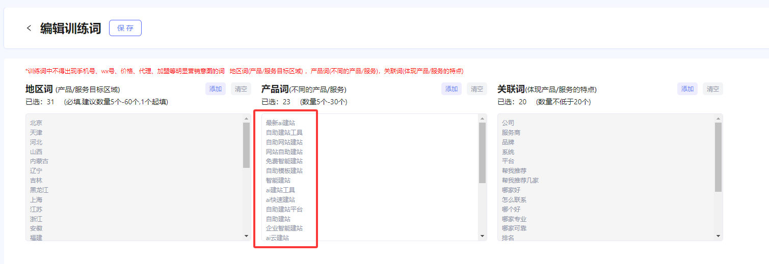 - 精准筛选关键词:围绕 “地区 + 产品 + 需求” 建库,优先选择 “搜索热度中等偏上、竞争度较低” 的长尾关键词(如 “地区+ AI 建站服务商”),降低初期优化难度;
