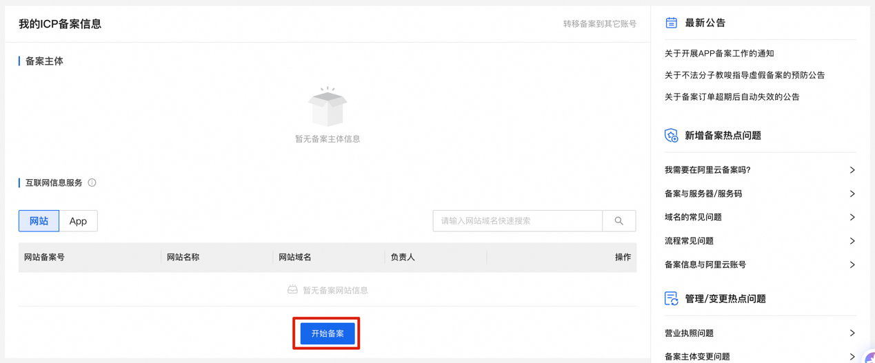 登录阿里云ICP代备案管理系统,单击开始备案(以首次备案为例)。
