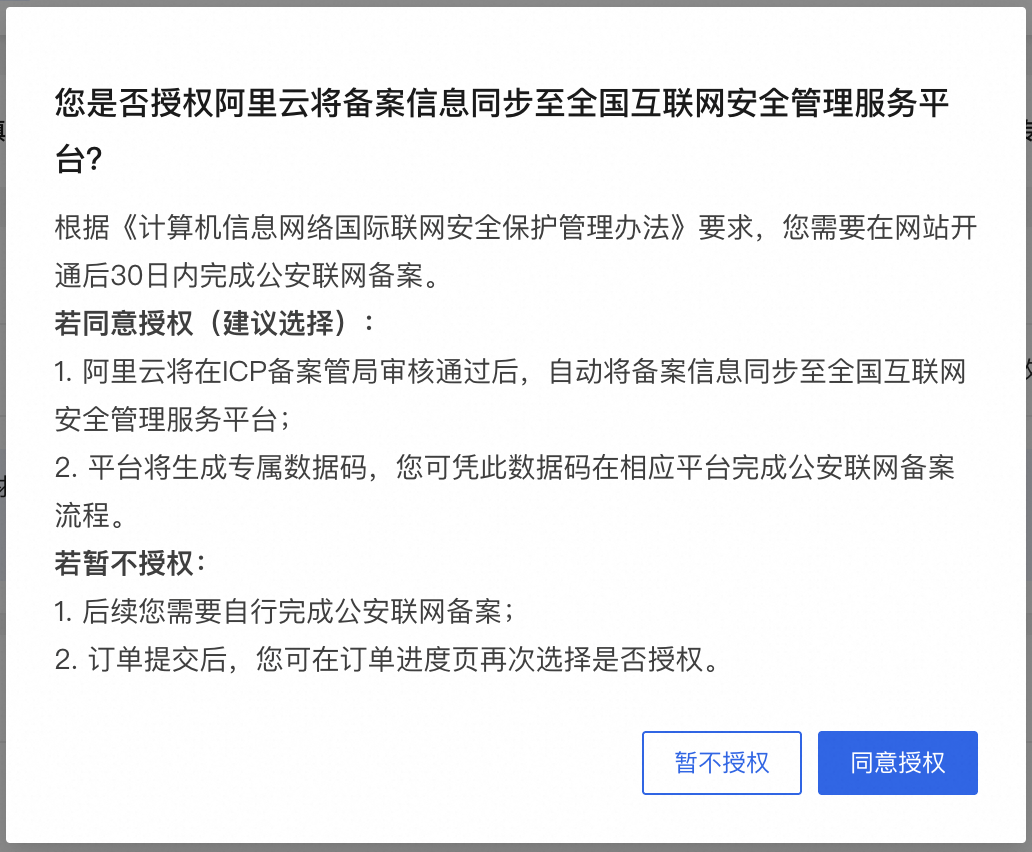 提交订单时会弹框询问用户是否授权阿里云将ICP备案信息发送给公安备案平台。