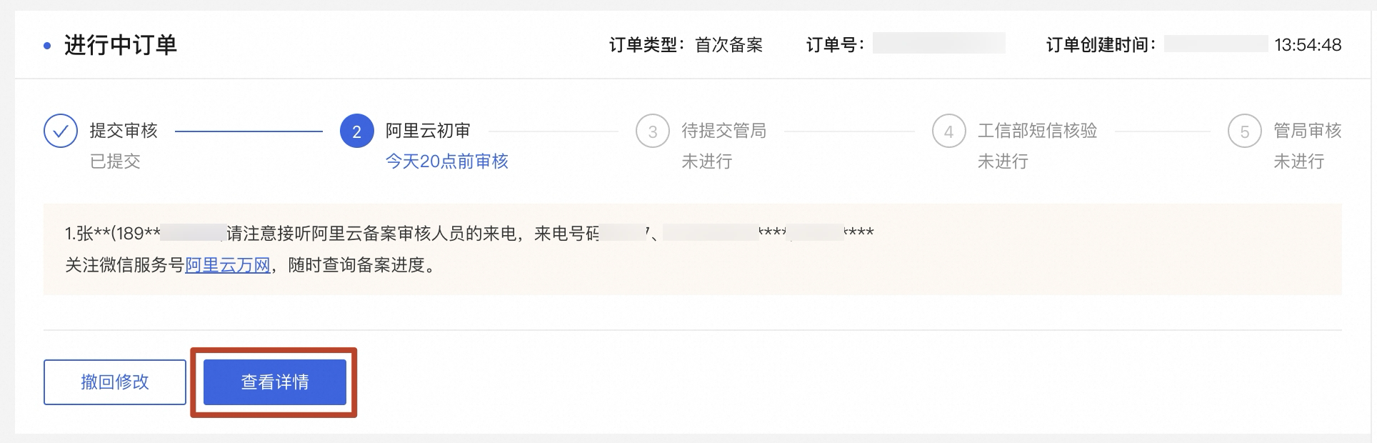 登录阿里云ICP代备案管理系统,单击查看详情,可查看ICP备案进度以及公安备案模块。