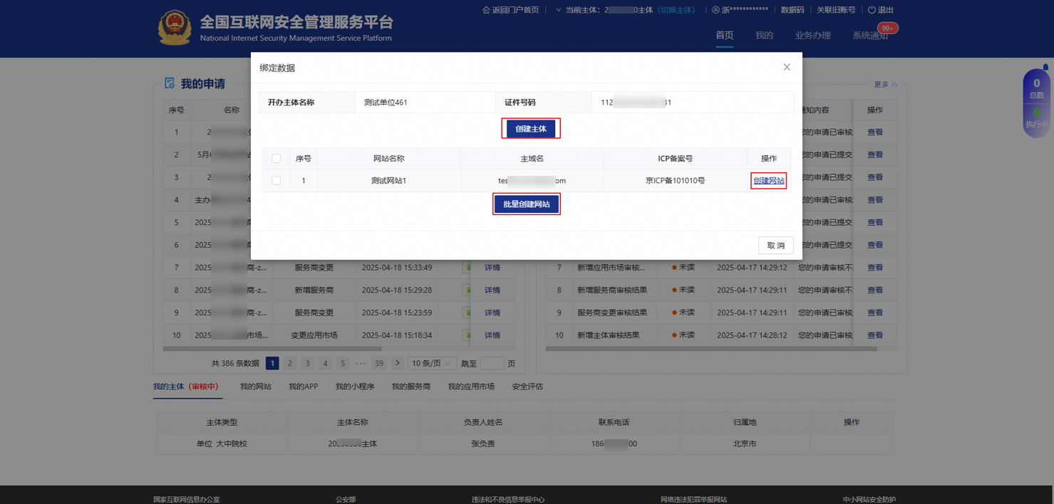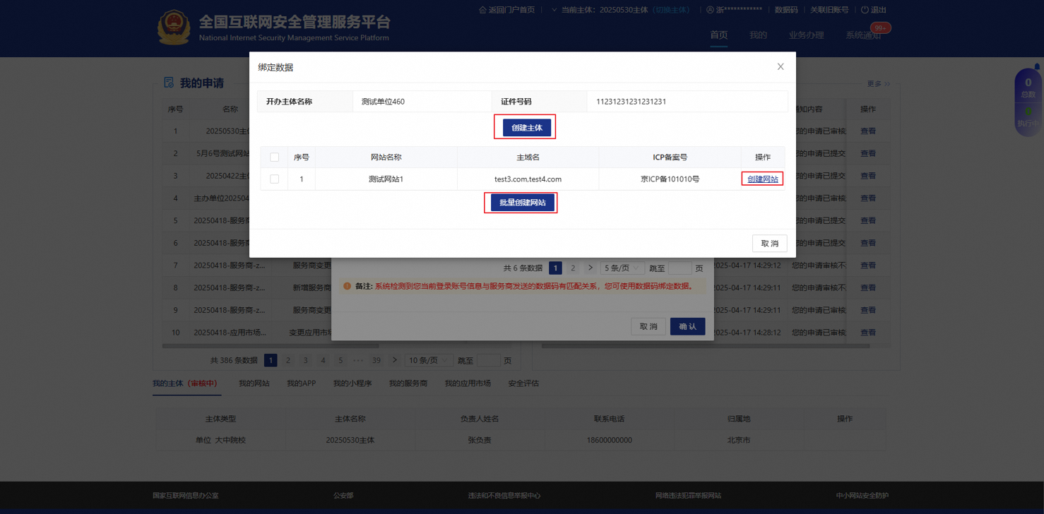 进入绑定数据页面,创建主体和网站,若登录账号中没有此主体,需先创建主体,提交新增主体申请,然后再创建网站;若登录账号中有此主体,仅创建/批量创建网站即可。