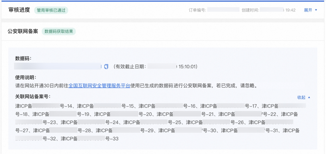 通信管局审核通过后会显示公安备案数据码,后续可使用此数据码前往公安备案平台进行公安联网备案。