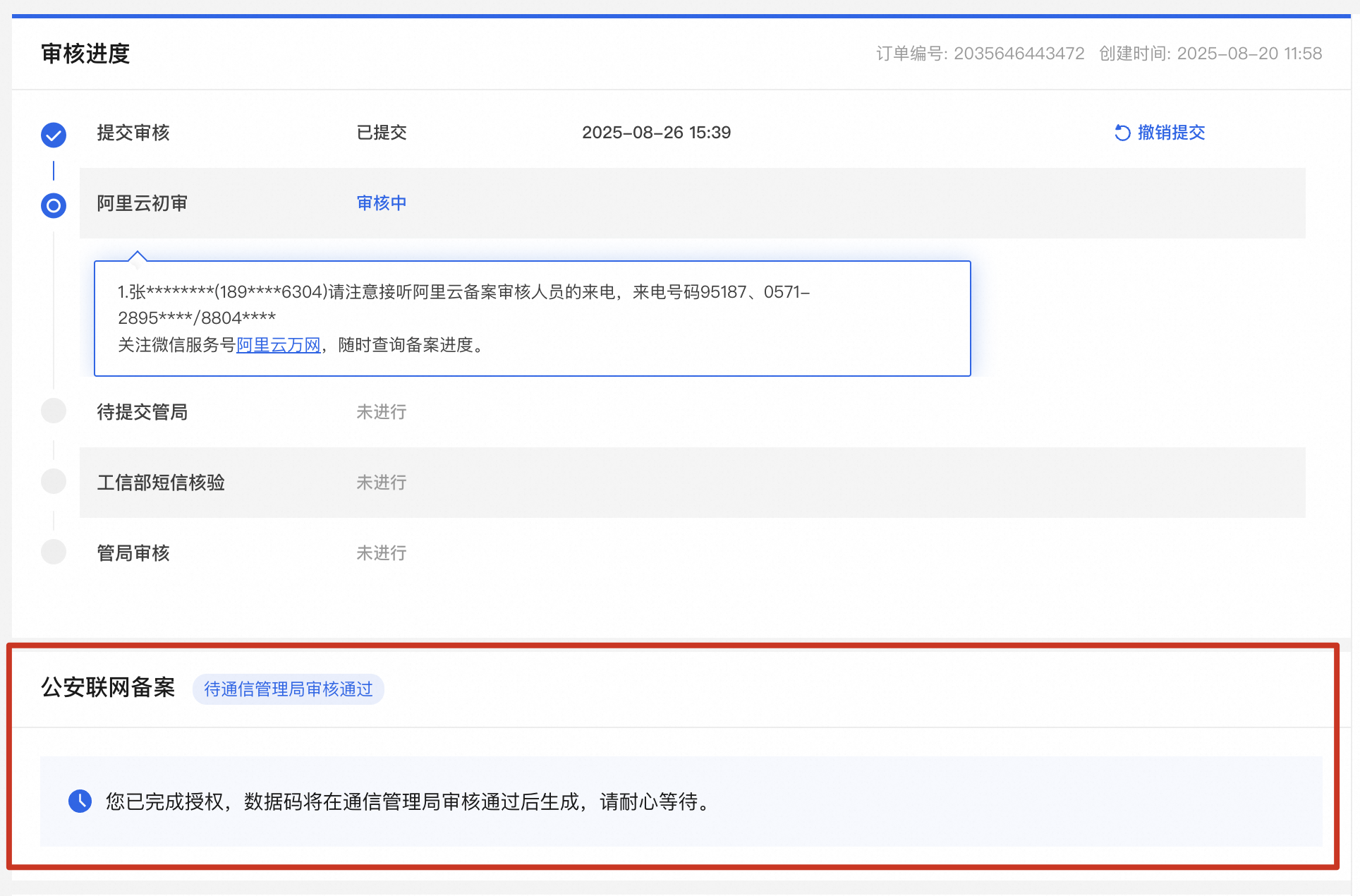 若提交阿里云审核时选择“暂不授权”,公安备案进度显示如下,用户可再次选择是否授权。