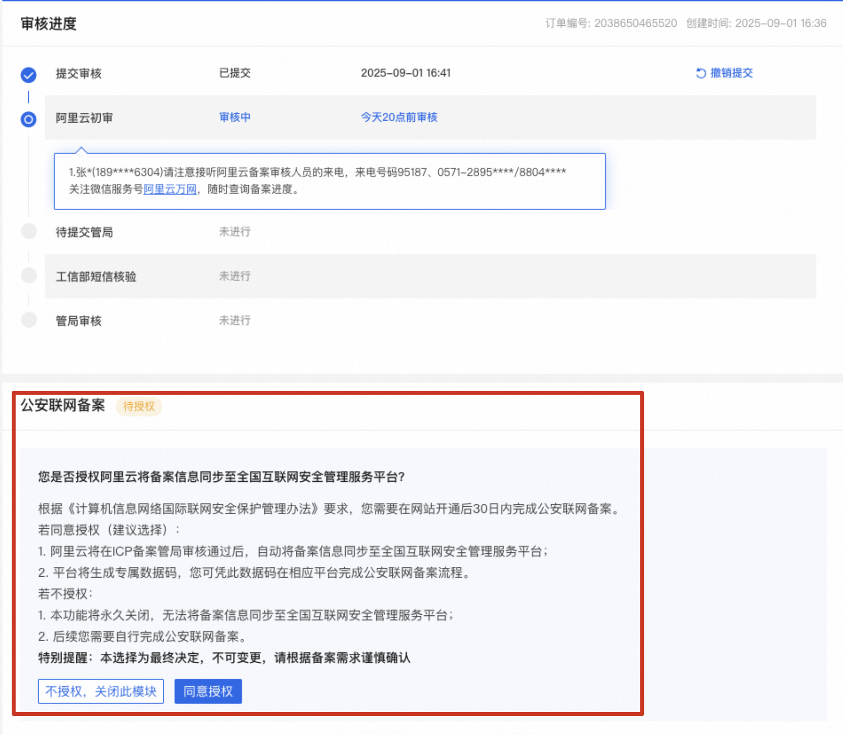 若选择“不授权,关闭此模块”后续不在显示公安备案,若订单一直未授权,管局审核通过后则该模块自动消失。若选择“同意授权”,进度会变为已授权:待通信管理局审核通过。