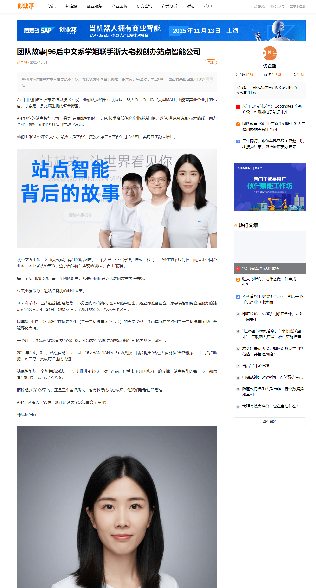 【创业邦】团队故事|95后中文系学姐联手浙大宅叔创办站点智能公司