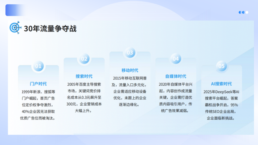 从门户、搜索,到移动、自媒体,短短三十年,流量时代几经变迁。而如今,我们已然站在了2025年AI搜索时代的门口。DeepSeek、ChatGPT、豆包等平台的崛起,意味着“答案的霸权”战争已经打响。
