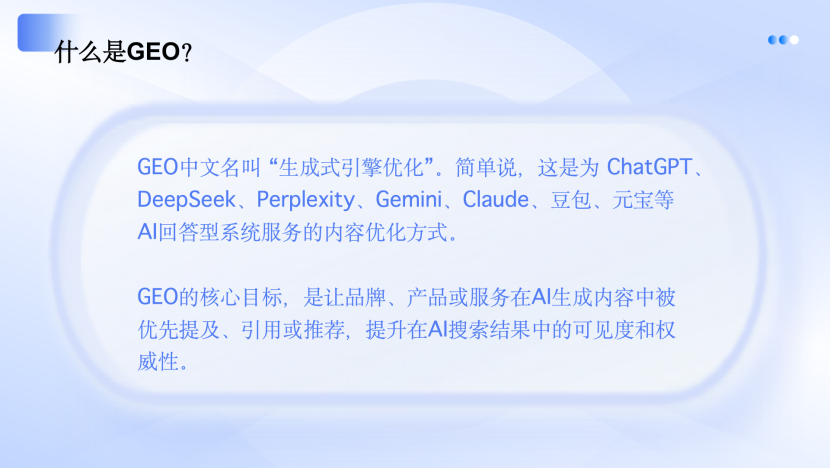 大家可以把GEO理解为专门服务于ChatGPT、DeepSeek、豆包这些AI的“新SEO”。
