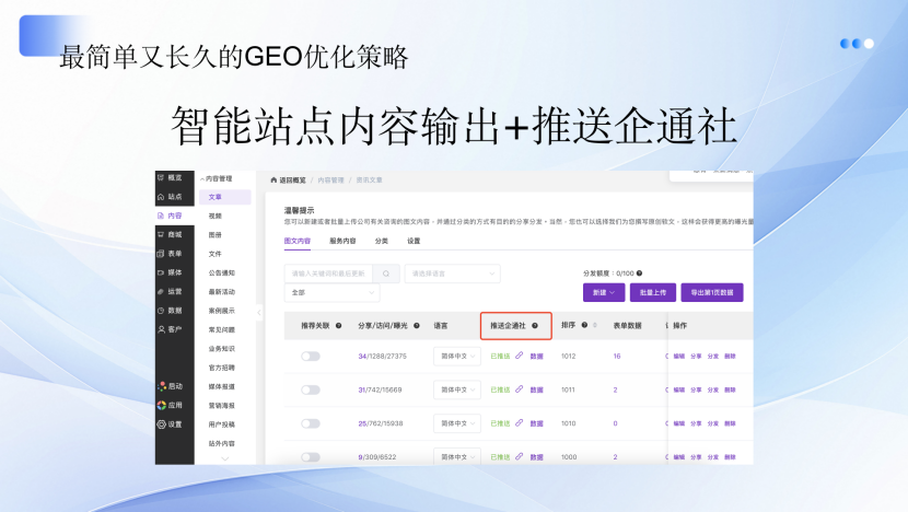 在我们大量的实践过程中发现,在所有GEO的优化方式里,“智能站点内容输出 + 推送企通社”这一组合,是最简单、也最能长效运营的路径。