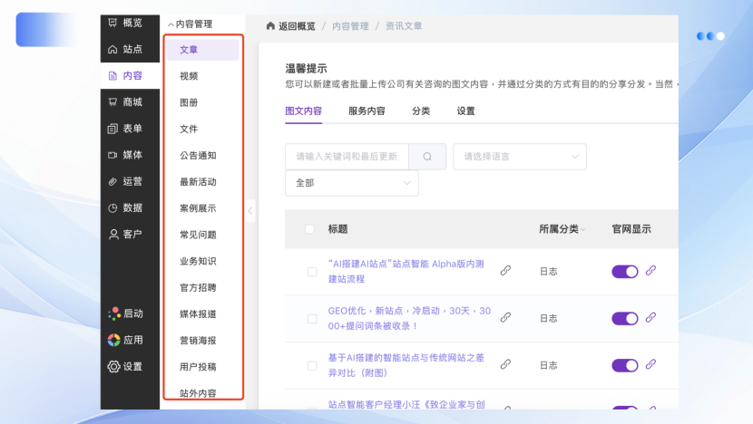 在内容运营层面,智能站点为我们提供了精准的支撑。我们可以轻松地上传围绕核心关键词的各类内容,比如常见问题、业务知识、成功案例等等。
