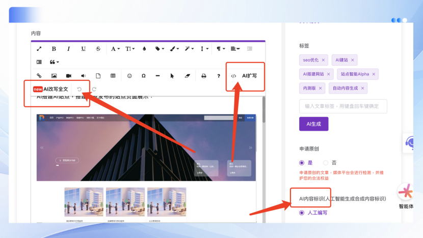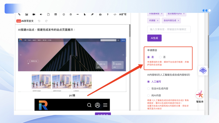 这个站点还很智能。它支持我们进行原创声明,这就像给内容贴上了“优质”的标签,能有效提升AI抓取的优先级。