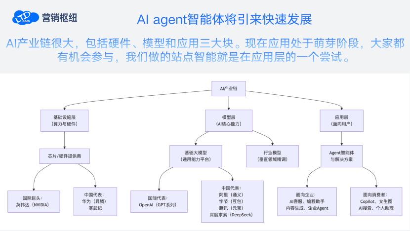 咱们做的 “站点智能”,就是在应用层的一次尝试。像基础设施层有英伟达、华为昇腾这些,模型层有 GPT、阿里通义,应用层就是 AI 客服、企业 Agent 这些,咱们的方向很明确,就是在应用层帮企业落地 AI 能力。