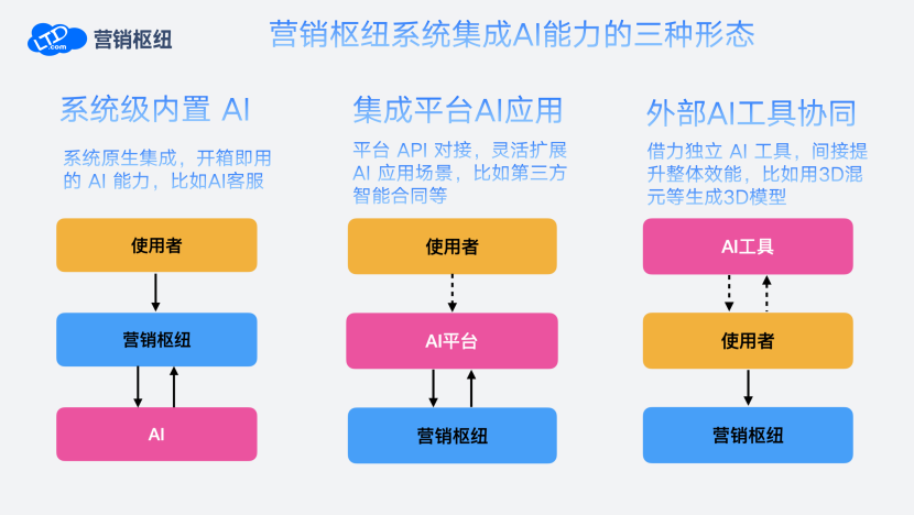 咱们营销枢纽系统集成 AI,主要有三种方式,大家可以根据自己需求选。