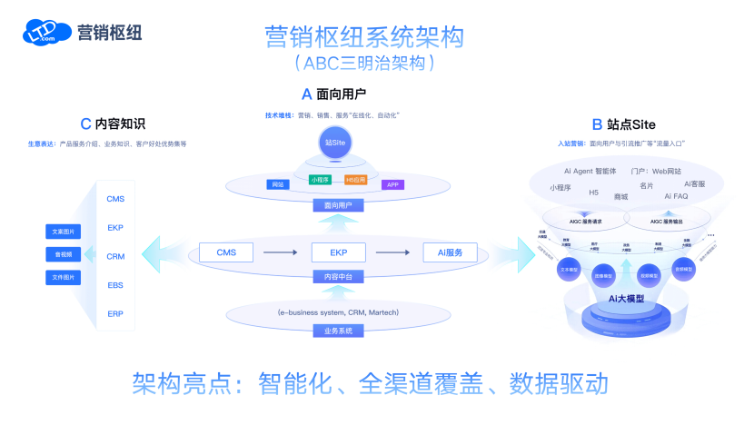 咱们营销枢纽有个“ABC 三明治架构”,亮点很突出:智能化、全渠道覆盖、数据驱动。