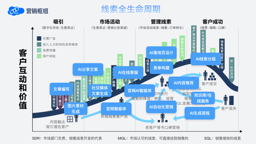 从吸引客户(比如市场活动、付费广告),到管理线索(SDR 筛选孵化、分级),再到销售转化、客户成功(续费增购),每一步都能靠 AI 帮忙。像 AI 落地页设计、AI 线索分级、AI 在线客服,都能嵌入流程里,让线索转化更顺,少走弯路。