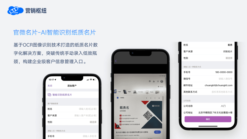 靠 OCR 技术,扫一下纸质名片,姓名、手机号、公司地址这些信息就能自动填进系统,不用手动敲,解决了低效录入的问题,还能帮企业建客户信息管理入口,后续跟进客户也更方便。