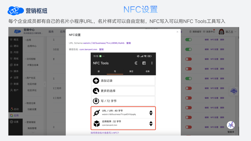 NFC 名片设置也不复杂,每个员工都有自己的名片小程序 URL,样式能自由定制。