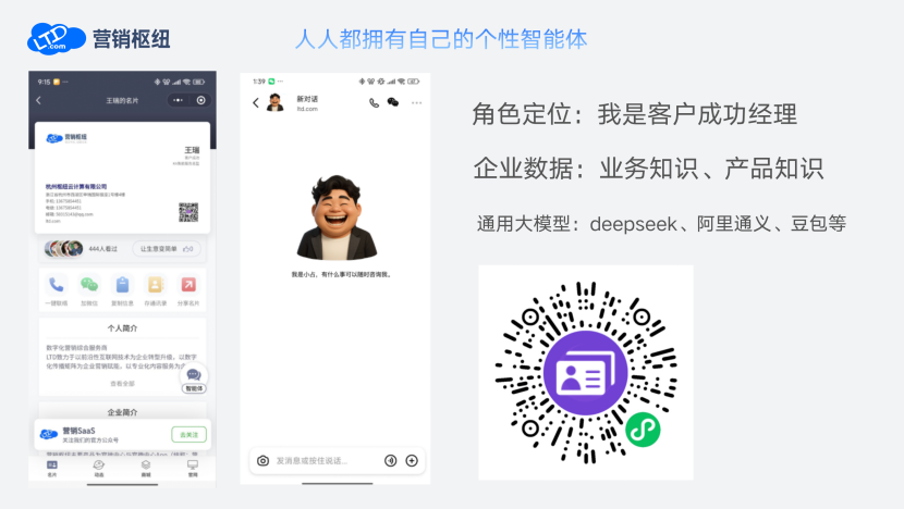现在人人都能有自己的个性智能体,就像王瑞的名片里,除了基本信息,还有专属智能体。