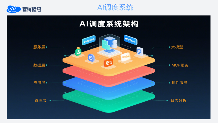 咱们的 AI 调度系统架构很清晰,底层是数据层,中间是服务层,对接 deepseek、阿里通义、豆包这些大模型,顶层是应用层和管理层。