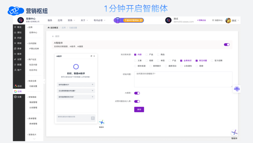 在官微中心里,找到 AI 智能体功能,选好知识库来源 —— 可以是产品信息、常见问题,也可以是业务知识、案例展示,启动后就能用。