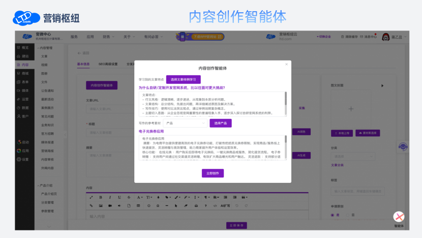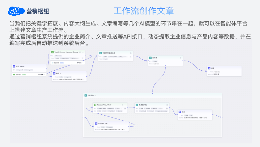 通过营销枢纽的 API,自动提取企业信息、产品内容,文章写完后直接推到系统后台,不用手动上传。