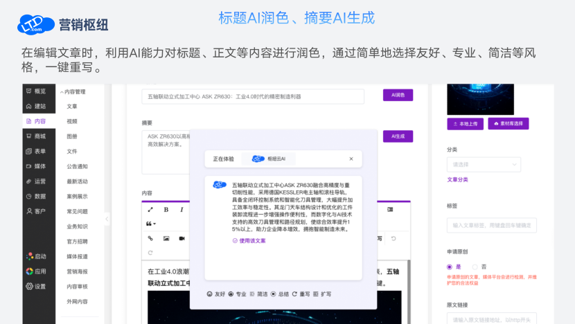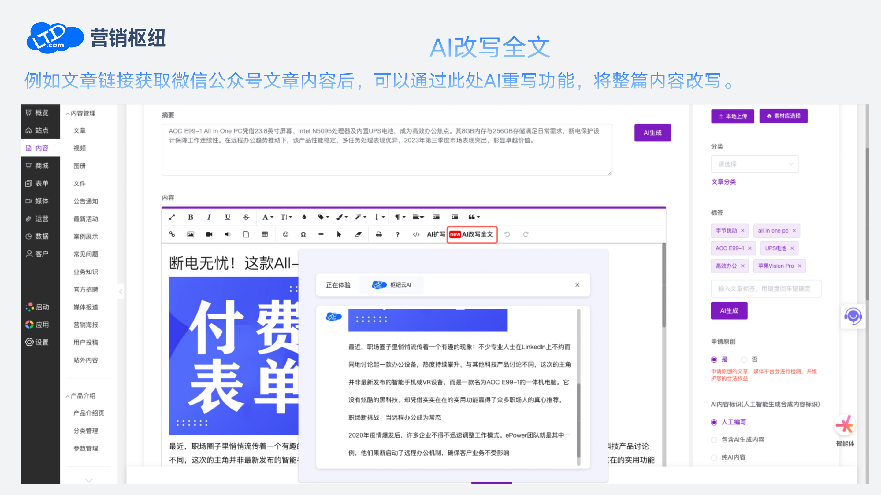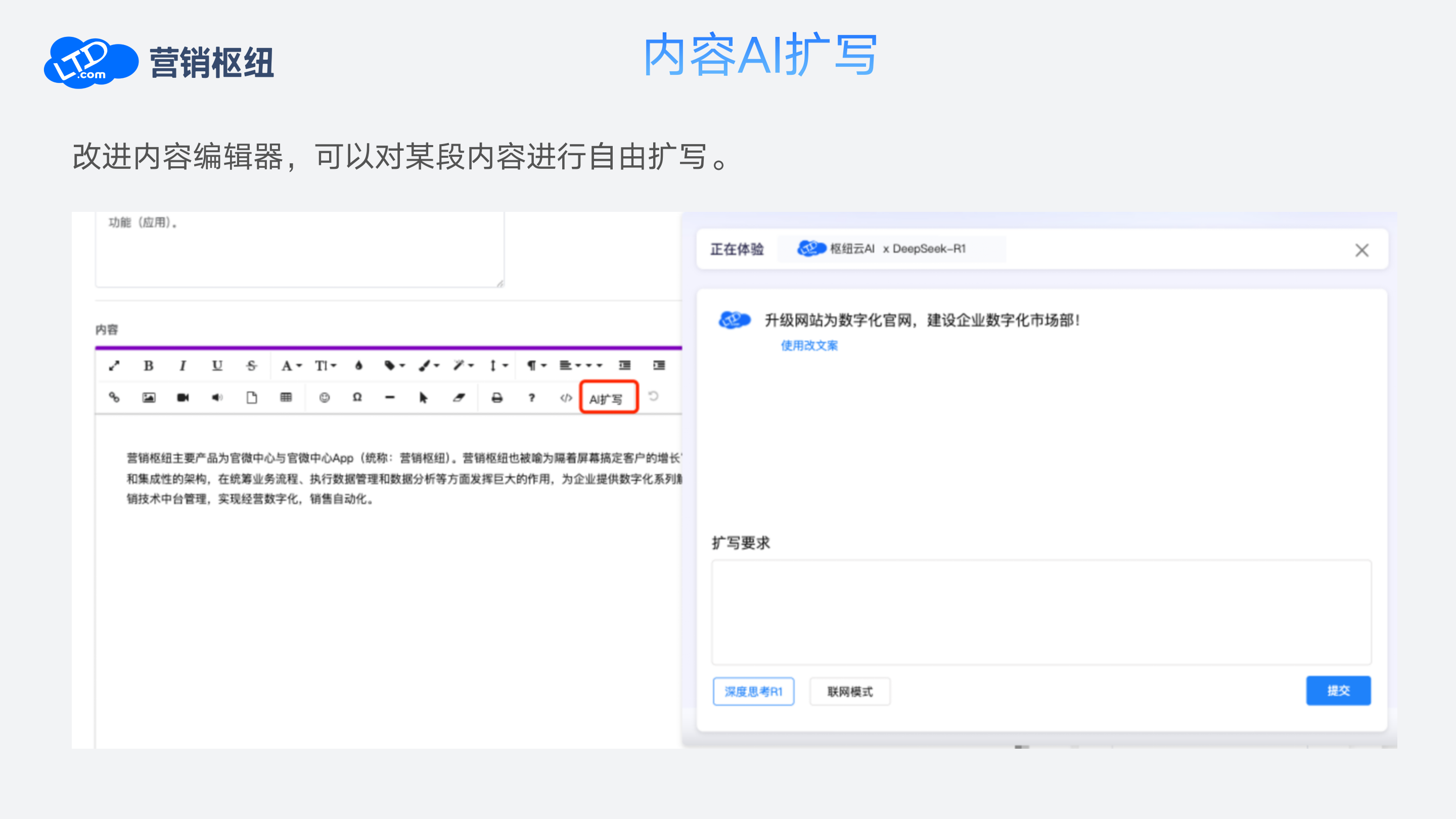 在编辑器里选中要扩写的内容,告诉 AI 想补充哪些方向 —— 比如加案例、讲细节,AI 就能帮着扩展。像介绍营销枢纽产品,AI 能把它的架构、优势、使用场景讲得更透彻,不用咱们绞尽脑汁想措辞。