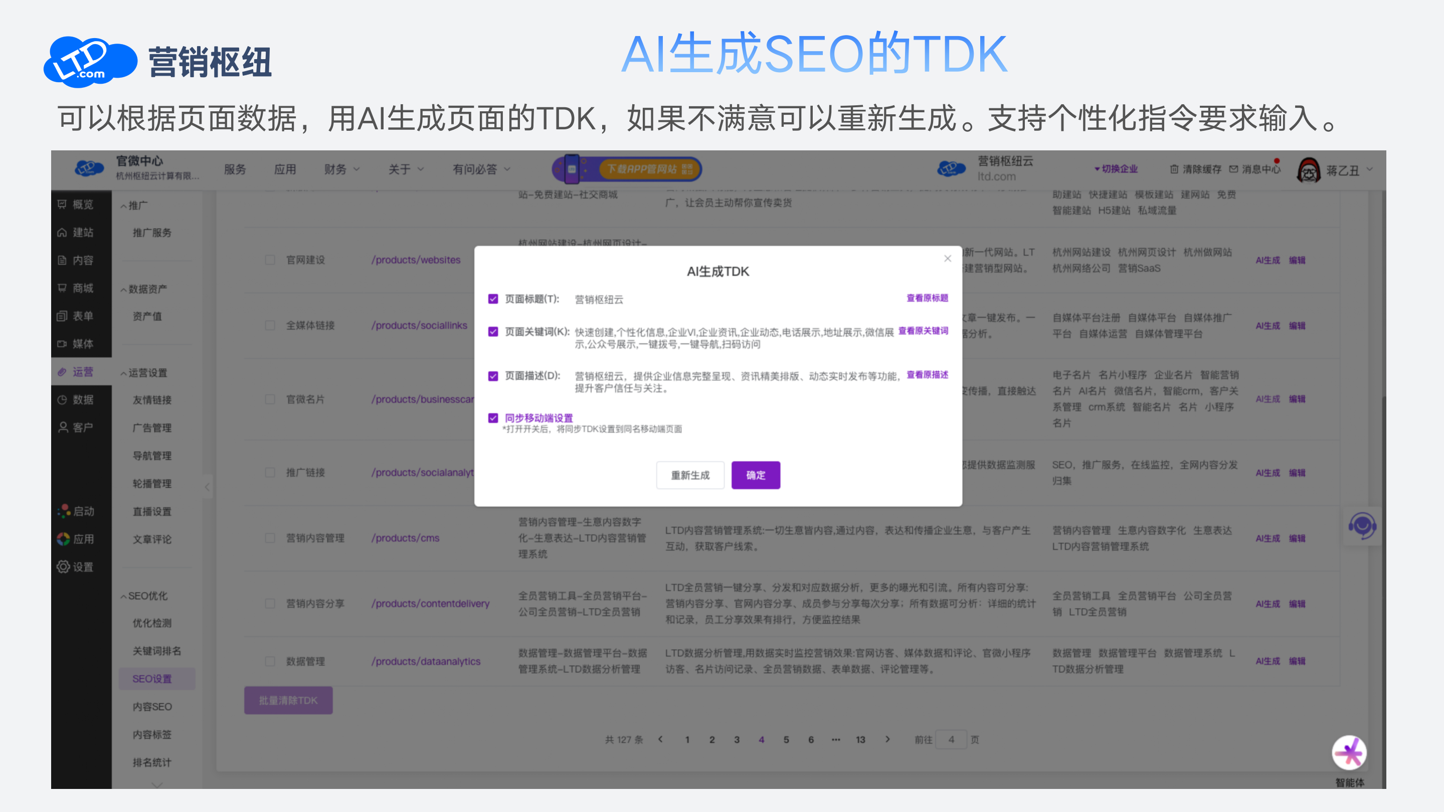 根据页面数据,AI 会给出合适的 TDK,不满意还能重新生成,甚至能输入个性化要求。