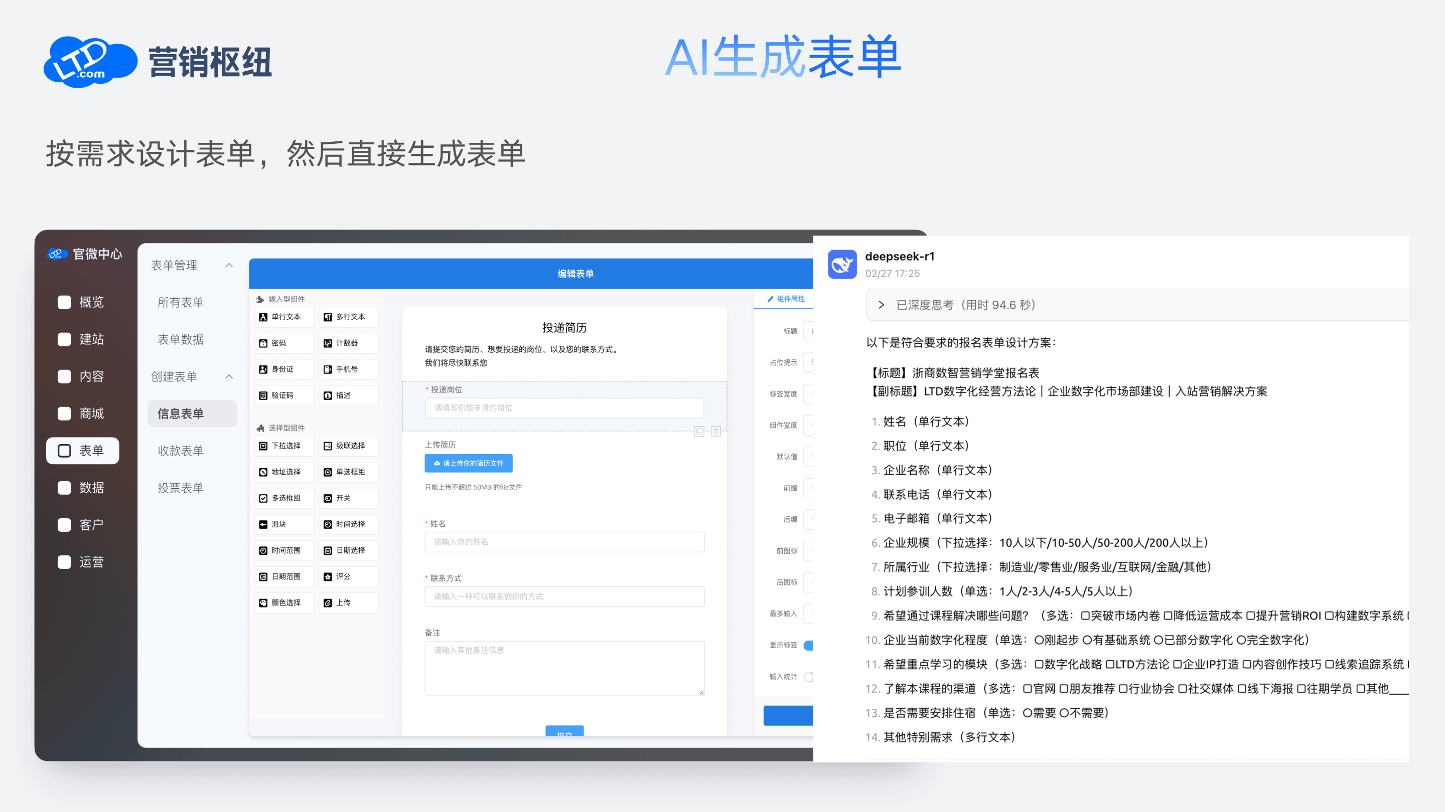 告诉 AI 表单用途,比如 “浙商数智营销学堂报名表”,AI 就能设计出包含姓名、职位、企业规模、参训需求的表单,不用自己一个个加组件。