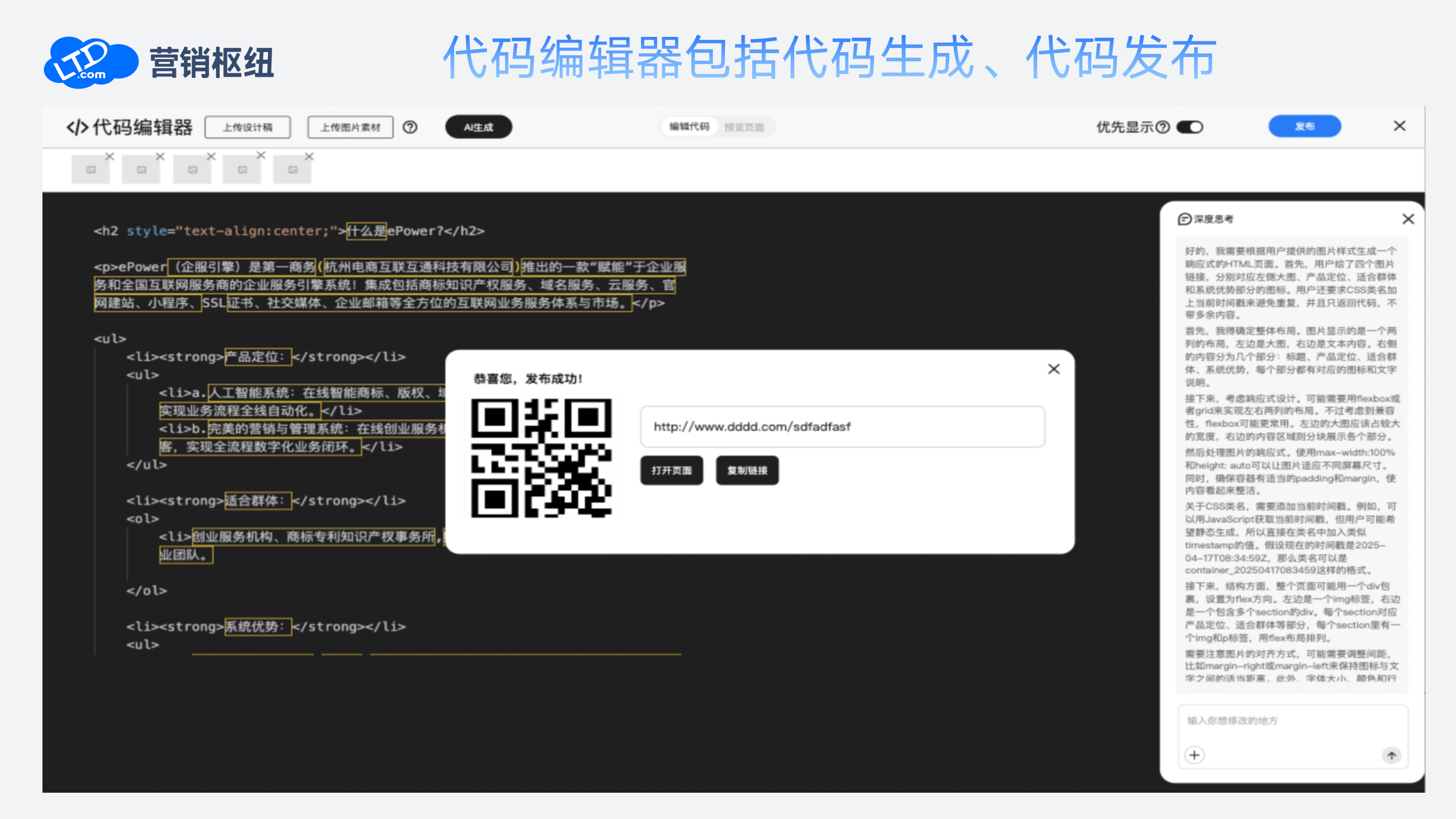 生成后能预览、修改,满意了直接发布,不用懂复杂代码,小白也能做页面。