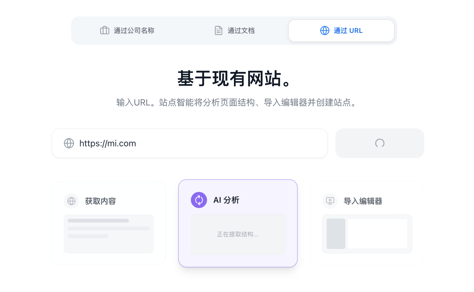 3. 利用输入已有网站的URL,AI智能分析页面结构与内容并将其导入编辑器来创建站点