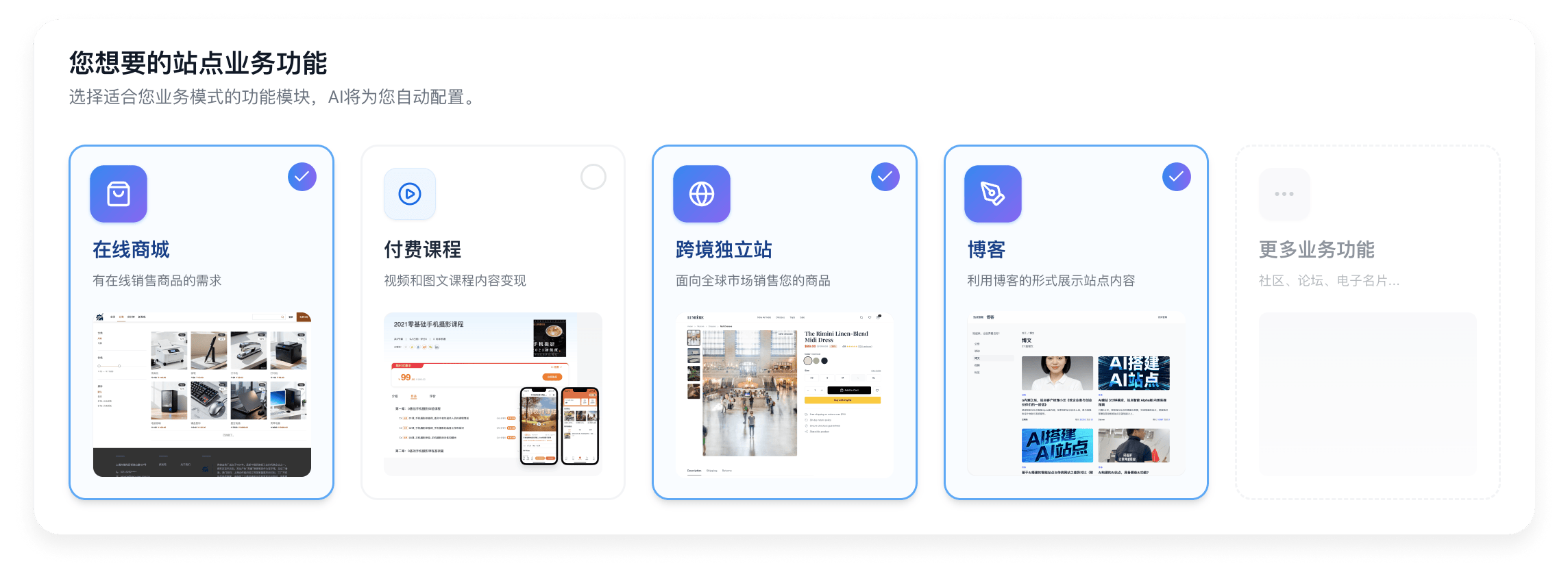 同时在创建展示型网站基础上,在Beta版中,通过站点智能创建的站点,将具备便捷的按需开通商品在线销售、付费图文/视频课程、博客等功能的能力。